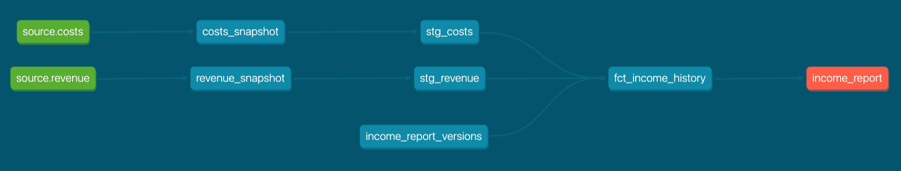 The original fct_income model now calculates the income for each version of source data, every time Joanne executes a dbt run. In other words, the downstream fct_ models are version-aware. Because of this, Joanne changes the name of fct_income to fct_income_history to be more descriptive.